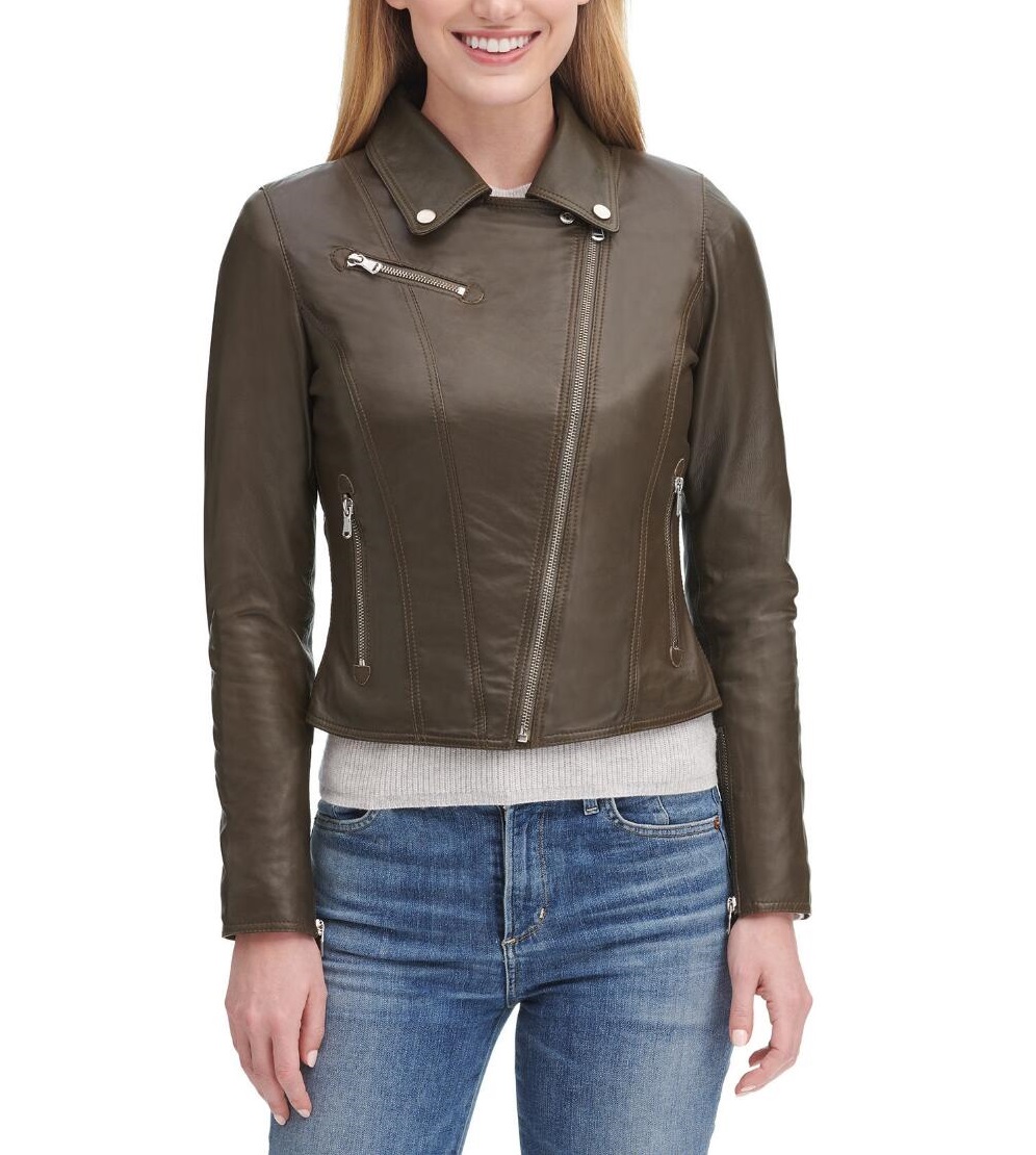 Asymmetrical Zip Green Leather Jacket With Zip Cuff
