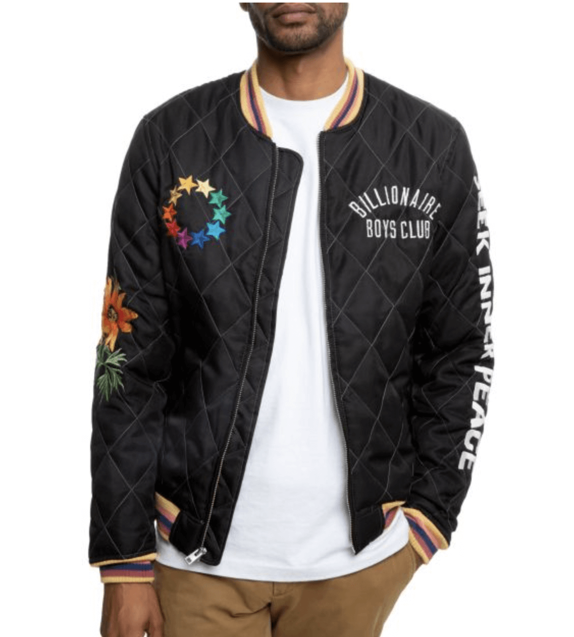 This Billionaire Boys Club Black Inner Peace Jacket is made from high-quality polyester material. The jacket is available in a glorious black color which gives it an innovative and enchanted look. The collar of the jacket is rib-knit. It has a zipper front closure. A soft viscose inner lining of the jacket keeps you warm and relaxed. This Billionaire Boys Club Black Peace Jacket has full-length sleeves that end with rib knit cuffs. The jacket has two side waist pockets for keeping stuff. The top-quality stitching of the Billionaire Boys Club Jacket makes it durable and desirable to wear.