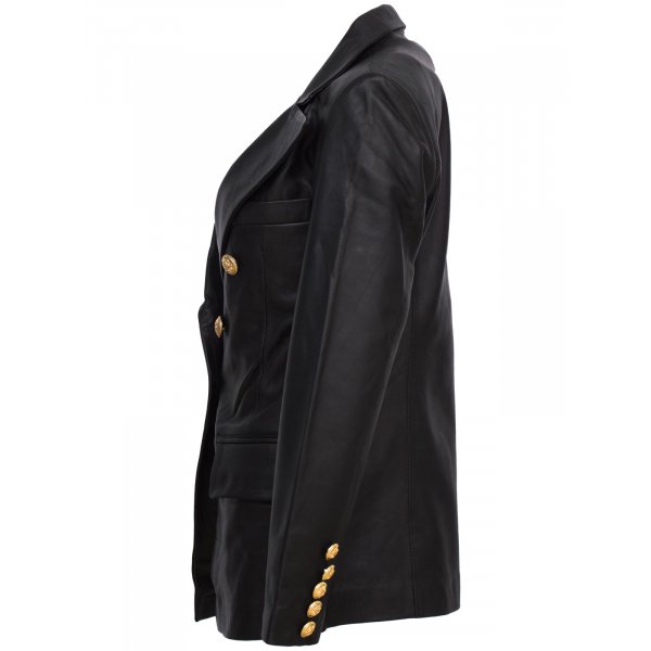 Need a style that works with almost every outfit? consider this Kim Kardashian Leather Coat for women worn by the fashion Diva Kim Kardashian. This ladies black leather jacket in double breasted style is a contemporary choice known for its classy features and a double-breasted front with short body type. In other words, this Kim Kardashian Long Blazer is your primary choice for the daily commute.