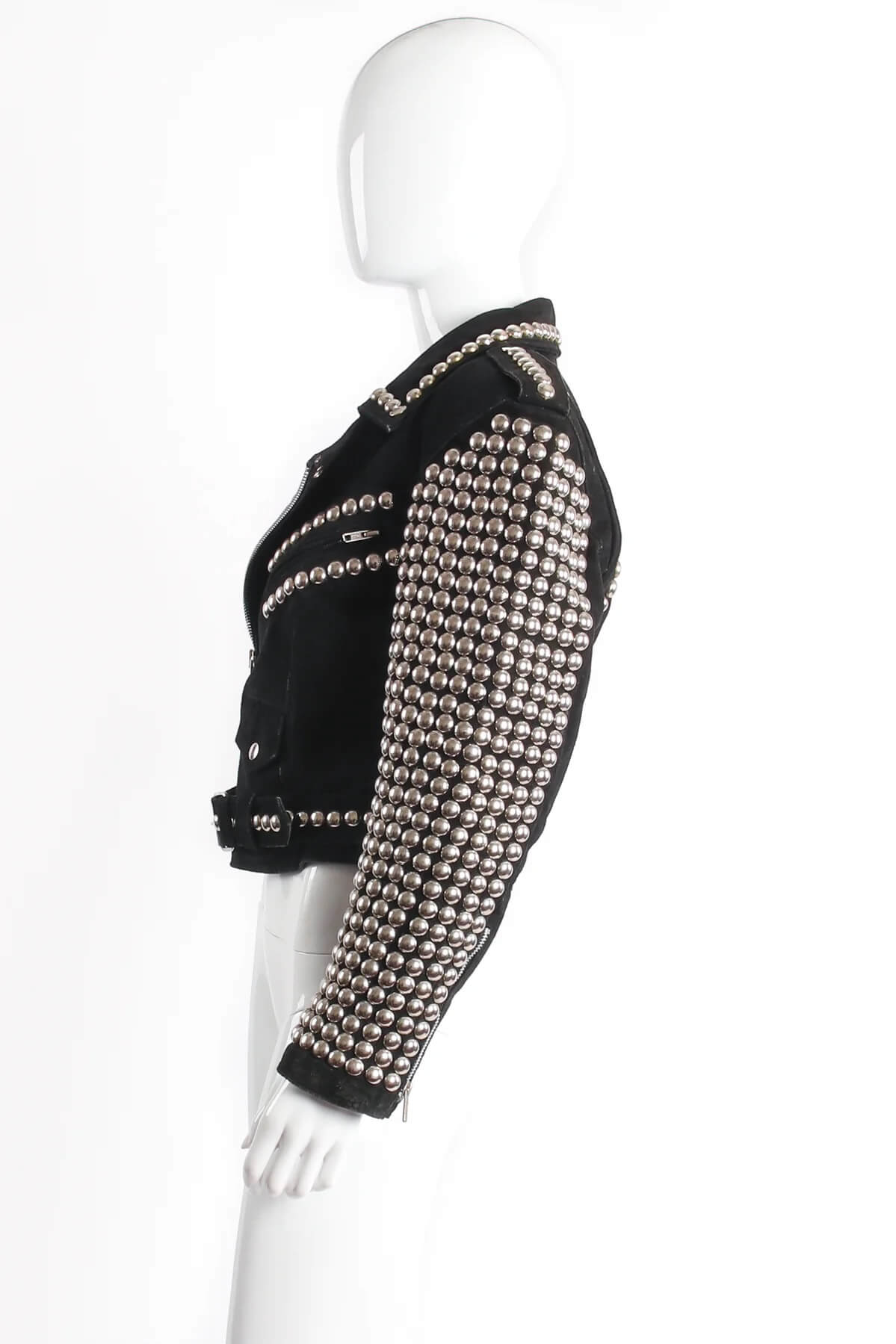 The Black Silver Studded Biker Suede Leather Jacket embodies an intersection of tradition and modernity, providing a wardrobe essential that transcends trends and stands as a testament to individuality.