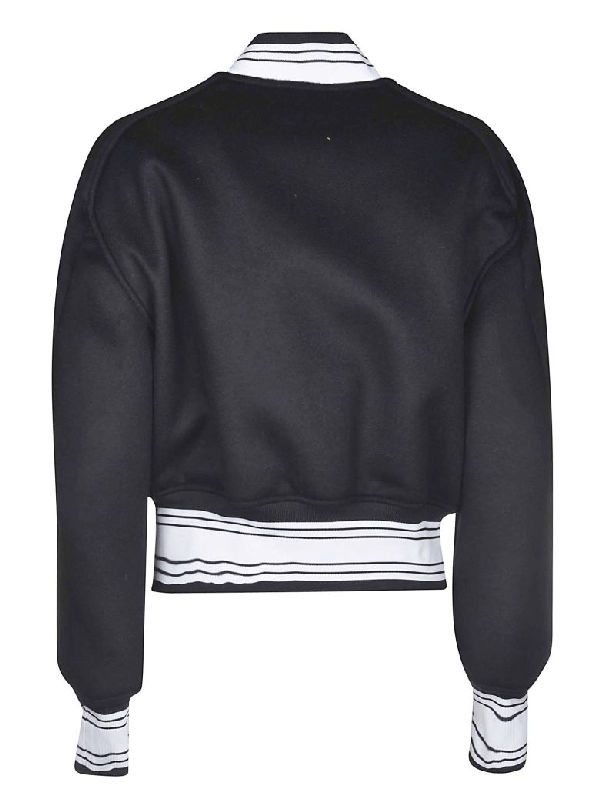 This Black White Wool Blend Varsity Jacket is guaranteed to hit the ball out of the park. This varsity jacket arrives for the new season with a front popper button closure, two W patches at the chest.