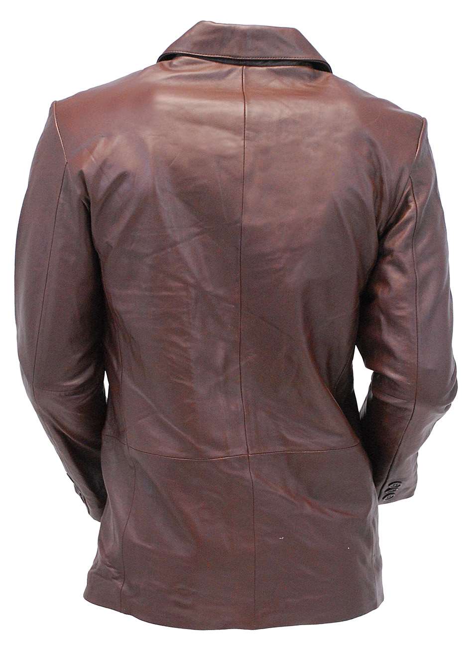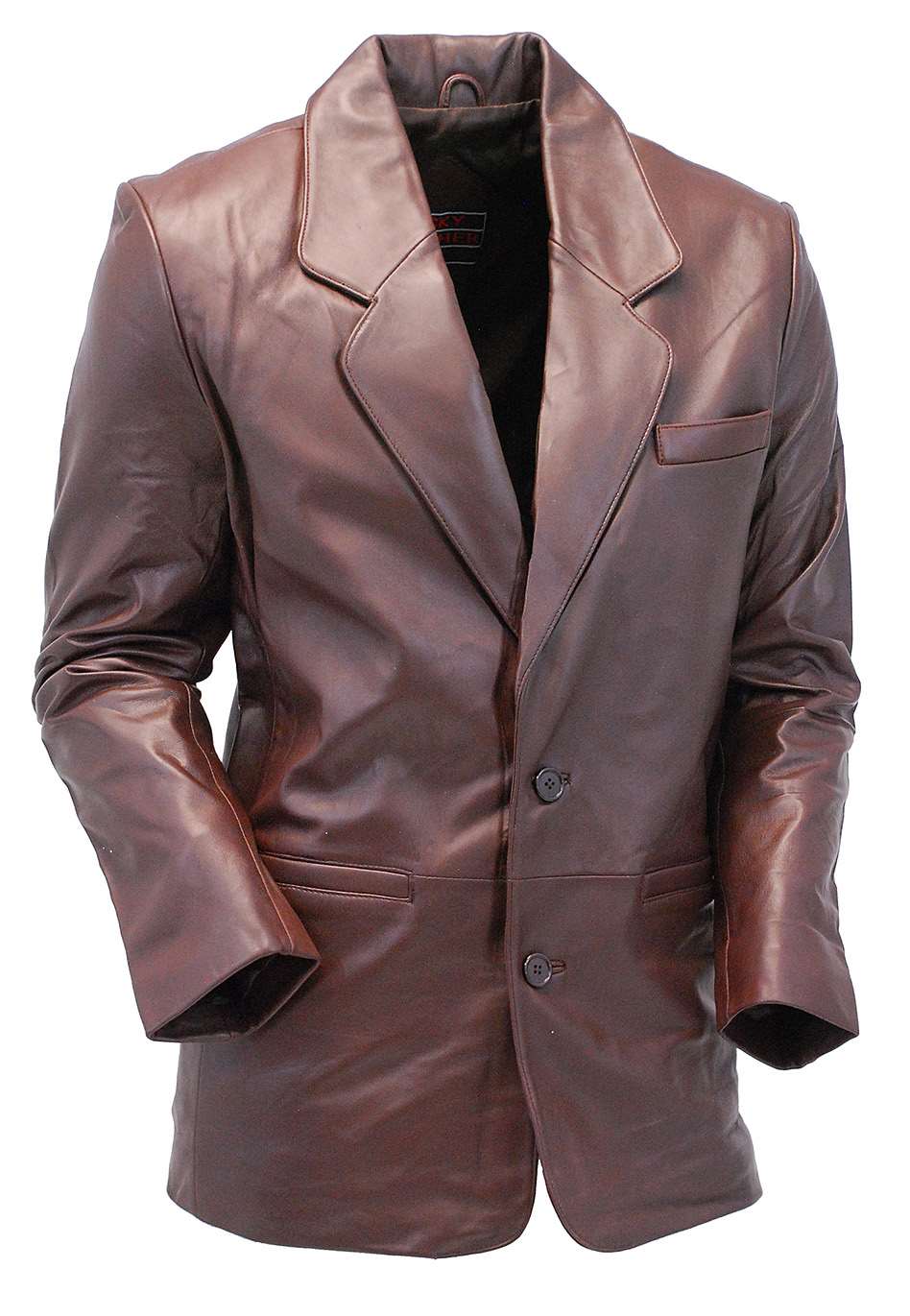 Classic style leather blazer in an ultra-soft spongy chocolate brown lambskin leather with features that include front pockets, left chest hanky pocket, two button front, soft lightly filled satin lining, and inside chest pocket.