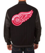This Detroit Red Wings Black Varsity Jacket is made from high-quality wool material. The jacket is available in a glorious black color which gives it an innovative and enchanted look. The collar of the jacket is a rib knit. It has a snap button front closure. The soft viscose inner lining of the jacket keeps you warm and relaxed. This Detroit Red Wings Varsity Jacket has full-length sleeves that end with rib knit cuffs. The jacket has two front pockets for keeping stuff. The top-quality stitching of the NHL Varsity Jacket makes it durable and desirable to wear.