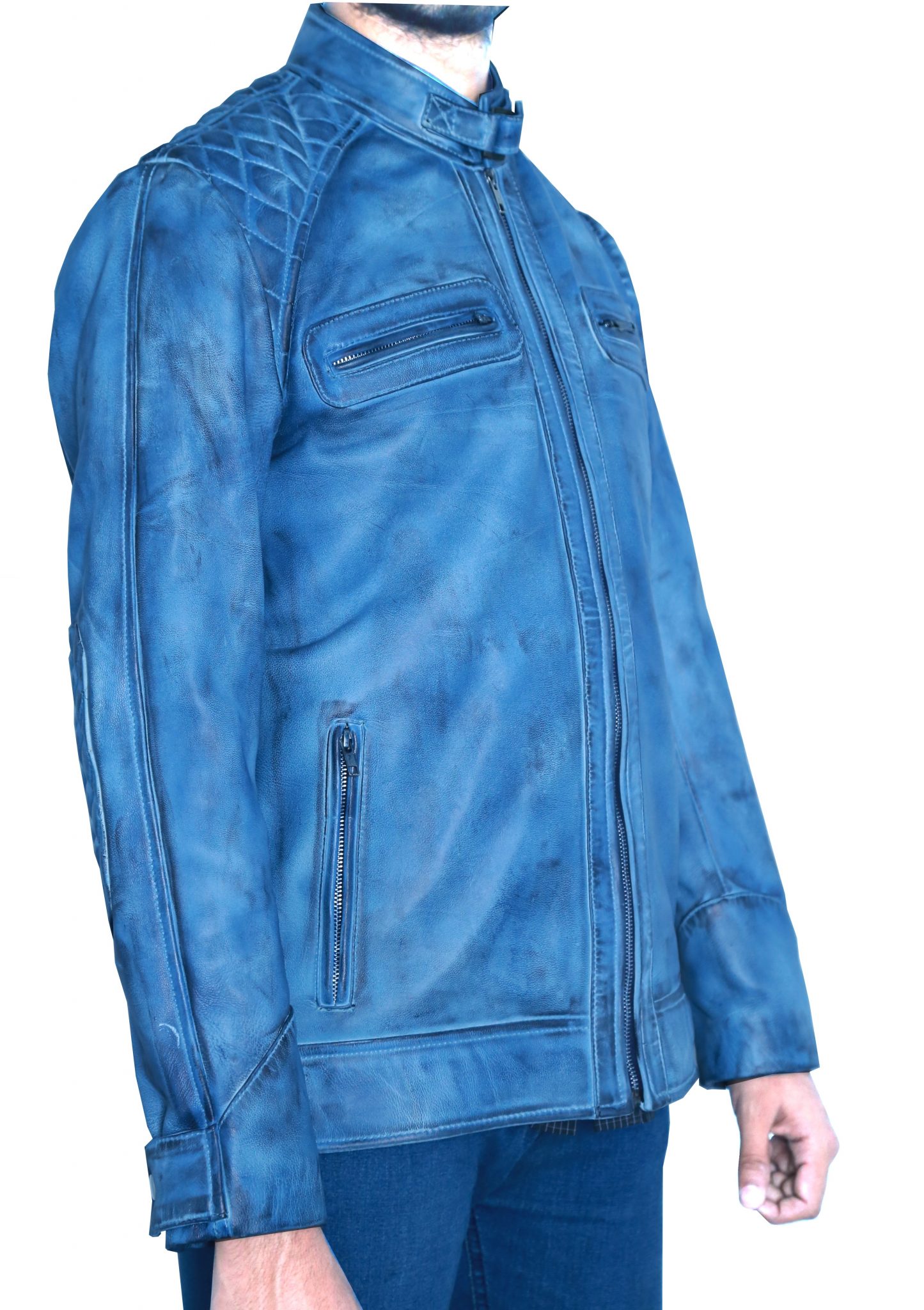 - This men’s sky blue jacket is made from high quality genuine sky blue leather. The jacket also has quilted style design on the shoulders making a unique item for your wardrobe collection. From the front the jacket has 2 zipped chest pockets and two zipped hand pockets with a zipper closure. It’s quality finishing and attractive design will definitely constrain others to copy your look, making it one of the best celebrity jacket for men’s.