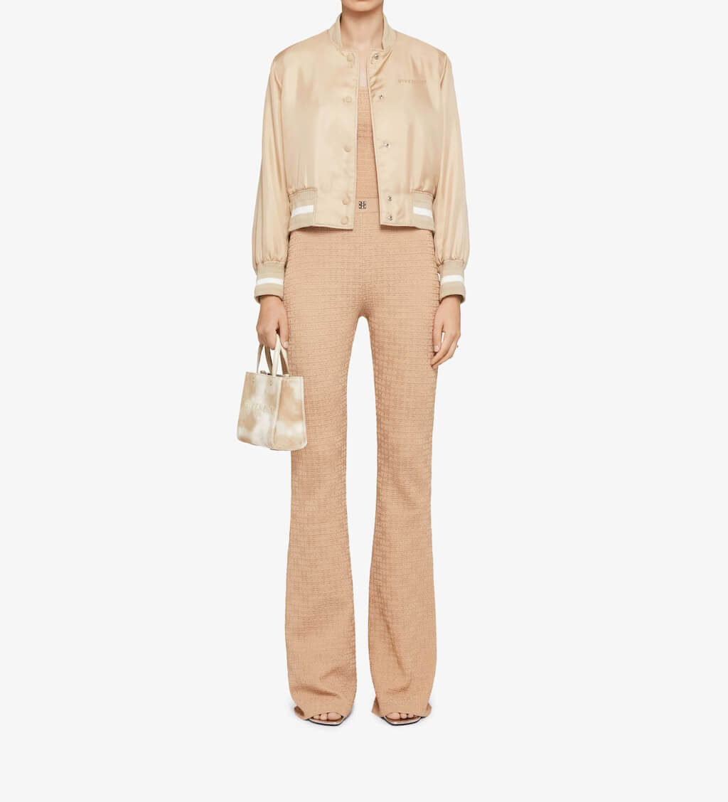 Experience the epitome of luxury and style with the Givenchy Full Snap Satin Bomber Jacket. This exquisite piece is a must-have for those who appreciate high-end fashion and comfort. The outer shell is crafted from satin, giving the jacket a sophisticated sheen that catches the eye. Its desert color is a unique and versatile shade that complements a variety of outfits.