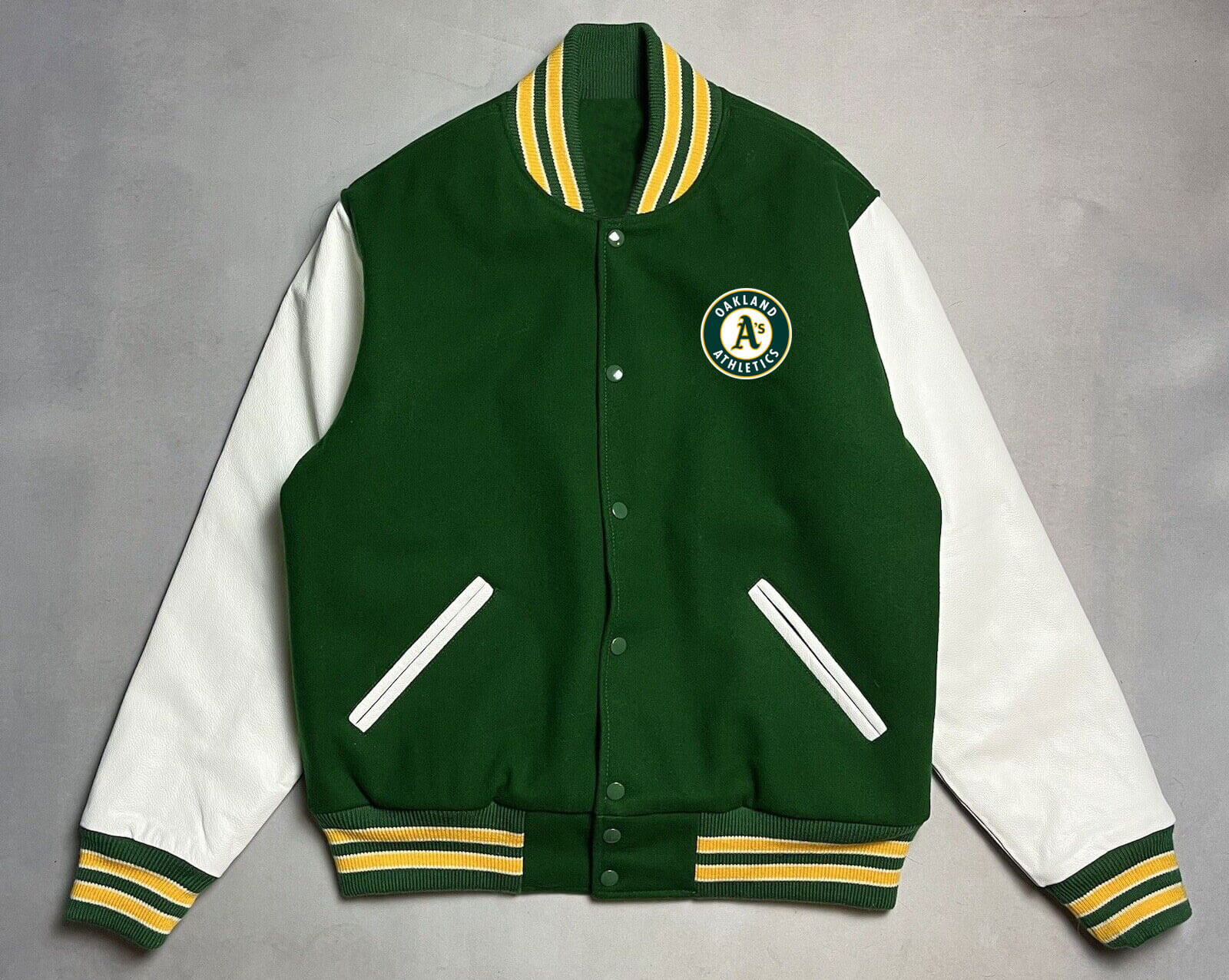 This “Green White MLB Oakland Athletics Varsity Jacket” is made from high-quality wool + leather material. It has an inner lined soft and comfortable Viscose stitched that keeps you warm in the cold and chilly weather. It has a Button Style for its closure with a Rib knitted Collar that makes it a retro classic. The Jacket has a Green and White color that makes it stand out. The Rib knitted cuffs and Rib knitted hemline also look attractive. The Jacket has Two Side Handwarmer pockets. Oakland Athletics Logo on the left chest looks very beautiful. The Jacket is durable to wear due to its fine-quality stitching.
