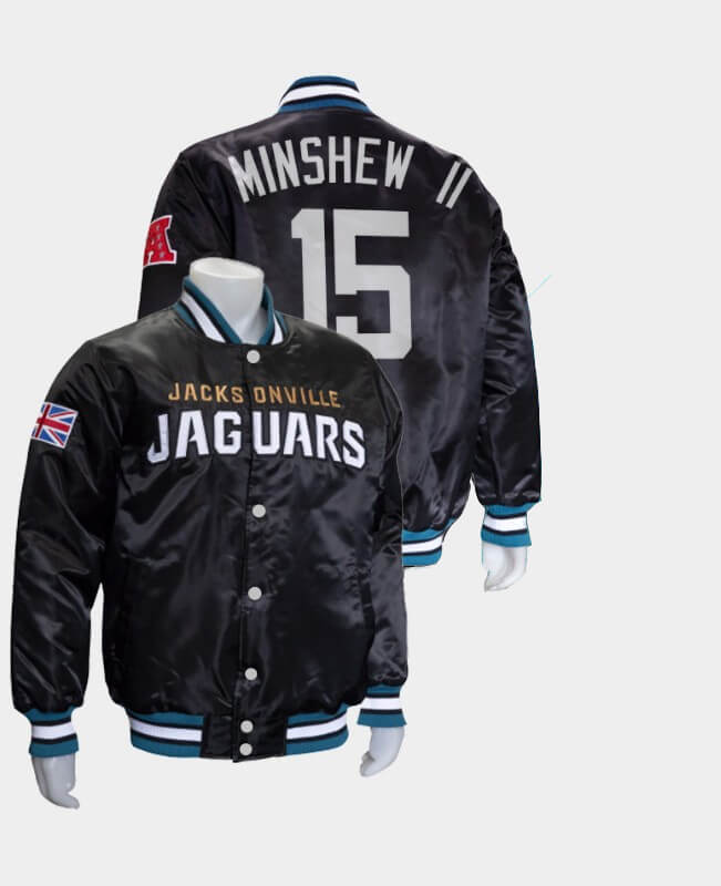 This “Jacksonville Jaguars Gardner Minshew Satin Jacket” is made from high-quality satin material. It has an inner lined soft and comfortable viscose stitched that keeps you warm and comfortable in the all-weather. The color of the jacket is black. The jacket front has a snap button closure with a rib-knitted collar, it looks beautiful. The rib-knitted cuffs and rib-knitted hemline also look attractive. There are two side diagonal pockets. The jacket is durable to wear due to its fine quality stitching.