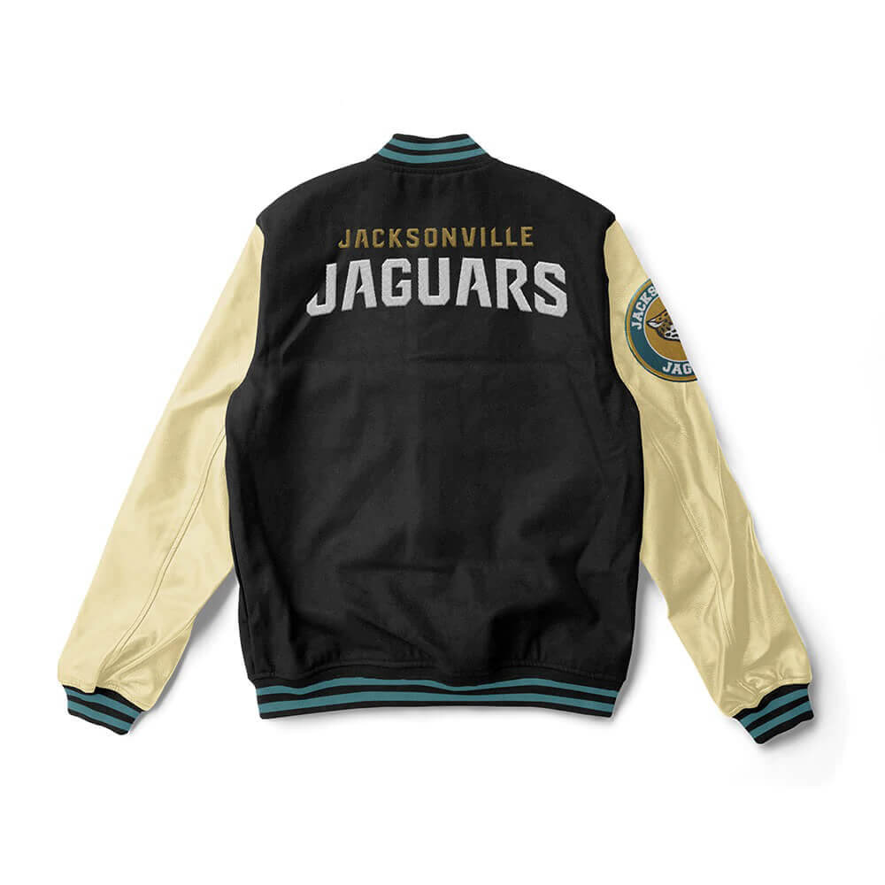 This “Jacksonville Jaguars Letterman Varsity Jacket” is made from high-quality wool material. It has an inner lined soft and comfortable viscose stitched that keeps you warm and comfortable in the all-weather. The color of the jacket is black and cream. The jacket front has a snap button closure with a rib-knitted collar, it looks beautiful. The rib-knitted cuffs and rib-knitted hemline also look attractive. There are two side diagonal pockets. The jacket is durable to wear due to its fine quality stitching.