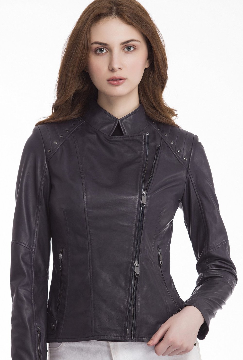 This feminine take on the classic moto is constructed from supple lamb leather and accented with onyx-toned hardware. This jacket features a tailored silhouette, zippered cuffs, an asymmetrical zip, top-stich detail on shoulders and back, and is tastefully detailed with rivet studs for added edge.