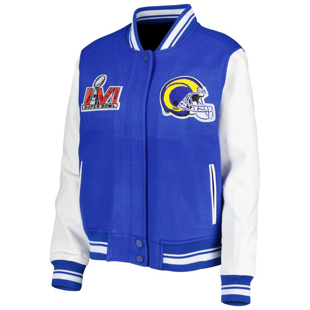 This Los Angeles Rams Super Bowl Varsity Jacket is made from high-quality wool material. The jacket is available in glorious blue and white color which gives it an innovative and enchanted look. The collar of the jacket is a rib knit collar. It has a snap front closure. The soft viscose inner lining of the jacket keeps you warm and relaxed. This Los Angeles Rams Varsity Jacket has full-length sleeves that end with rib knit cuffs. The jacket has two front pockets for keeping stuff. The top-quality stitching of the Los Angeles Rams Varsity Jacket makes it durable and desirable to wear.
