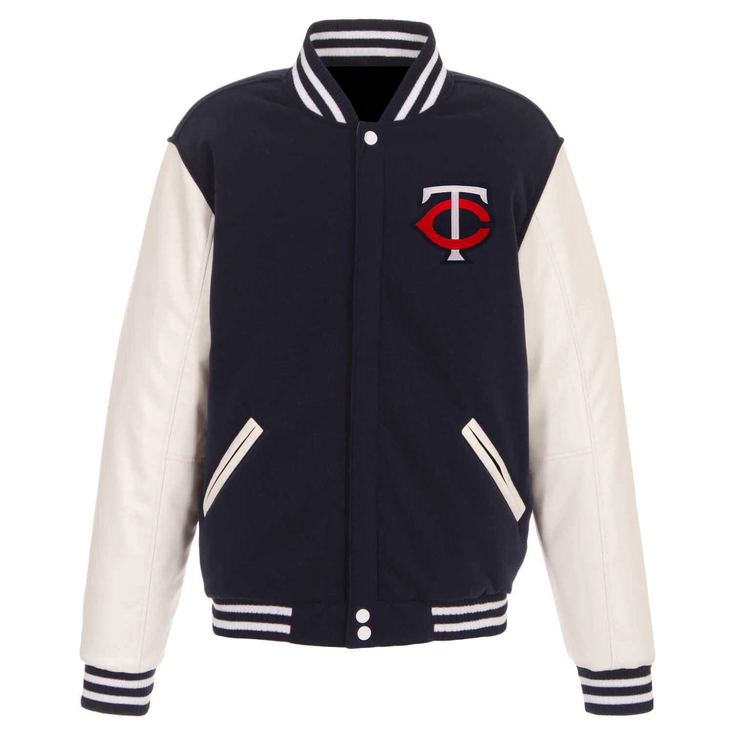 This “MLB Navy White Minnesota Twins Varsity Jacket” is made from high-quality wool + leather material. It has an inner lined soft and comfortable viscose stitched that keeps you warm and comfortable in the all-weather. The color of the jacket is navy and white. The jacket front has a flap button closure with a rib-knitted collar, it looks beautiful. The rib-knitted cuffs and rib-knitted hemline also look attractive. There are two side diagonal pockets. The jacket is durable to wear due to its fine quality stitching.