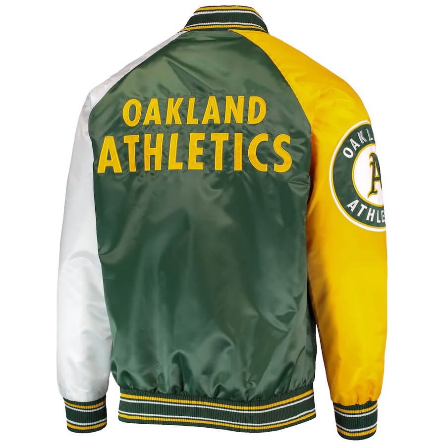 This “MLB Oakland Athletics Tricolor Satin Jacket” is made from high-quality satin material. It has an inner lined soft and comfortable Viscose stitched that keeps you warm in the cold and chilly weather. It has a front Button Style for its closure with a Rib knitted collar that makes it a retro classic. The Jacket has a Multicolor that makes it stand out. The Rib knitted cuffs and Rib knitted hemline also look attractive. The Jacket has Two side Handwarmer pockets. The Oakland Athletics Logo on the left chest looks very beautiful. The jacket is durable to wear due to its fine quality stitching.