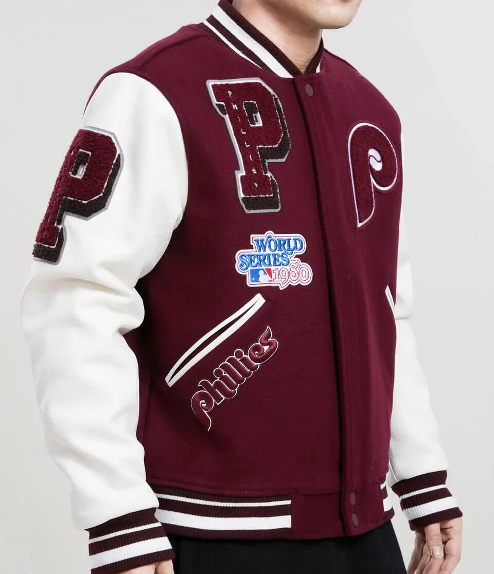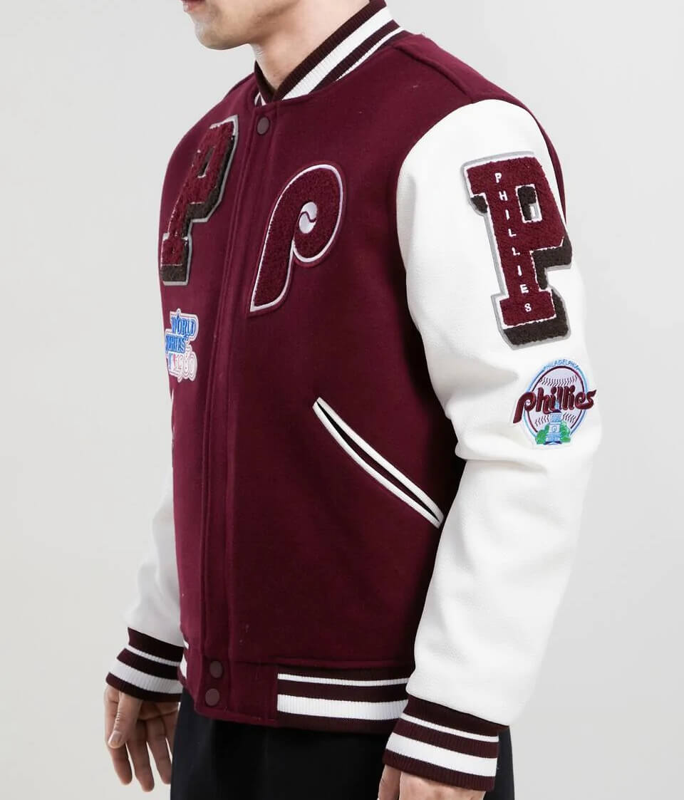 This “MLB Philadelphia Phillies Logo Varsity Jacket” is made from high-quality wool + leather material. It has an inner lined soft and comfortable Viscose stitched that keeps you warm in the cold and chilly weather. It has a Button Style for its closure with a Rib knitted Collar that makes it a retro classic. The Jacket has a Maroon and White color that makes it stand out. The Rib knitted cuffs and Rib knitted hemline also look attractive. The Jacket has Two Side handwarmer pockets and looks very beautiful. The Jacket is durable to wear due to its fine-quality stitching.
