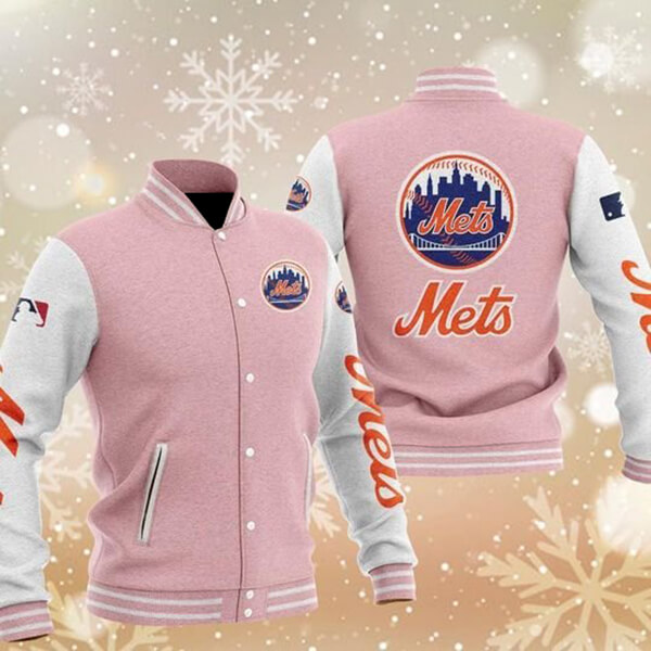 This “MLB Pink New York Mets Baseball Varsity Jacket” is made from high-quality wool material. It has an inner lined soft and comfortable viscose stitched that keeps you warm and comfortable in the all-weather. The color of the jacket is pink and white. The jacket front has a snap button closure with a rib-knitted collar, it looks beautiful. The rib-knitted cuffs and rib-knitted hemline also look attractive. There are two side diagonal pockets. The jacket is durable to wear due to its fine quality stitching.