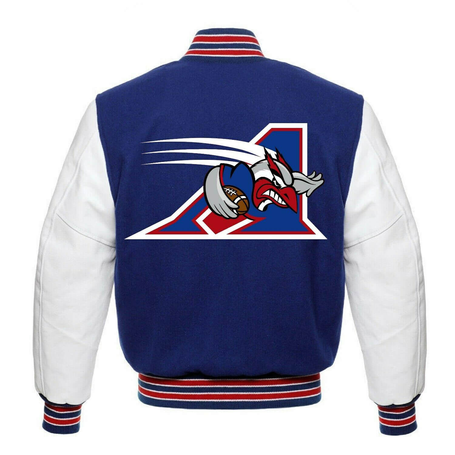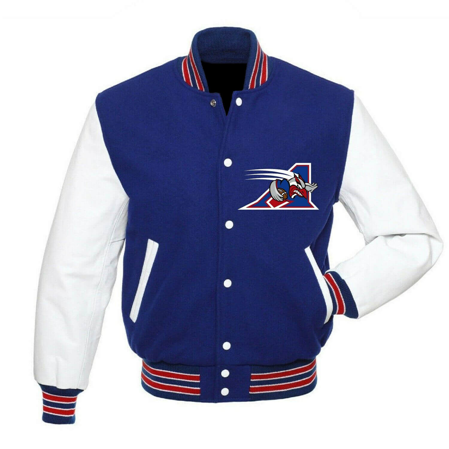 This “Montreal Alouettes CFL Team Varsity Jacket” is made from high-quality wool material. It has an inner lined soft and comfortable Viscose stitched that keeps you warm in the cold and chilly weather. It has a front Button style for its closure with a Rib knitted collar that makes it a retro classic. The Jacket has a Blue and White color that makes it stand out. The Rib knitted cuffs also look attractive. The Jacket has Two Side Handwarmer pockets. The Montreal Alouettes Logo on the left chest and on the back looks beautiful. The jacket is durable to wear due to its fine quality stitching.