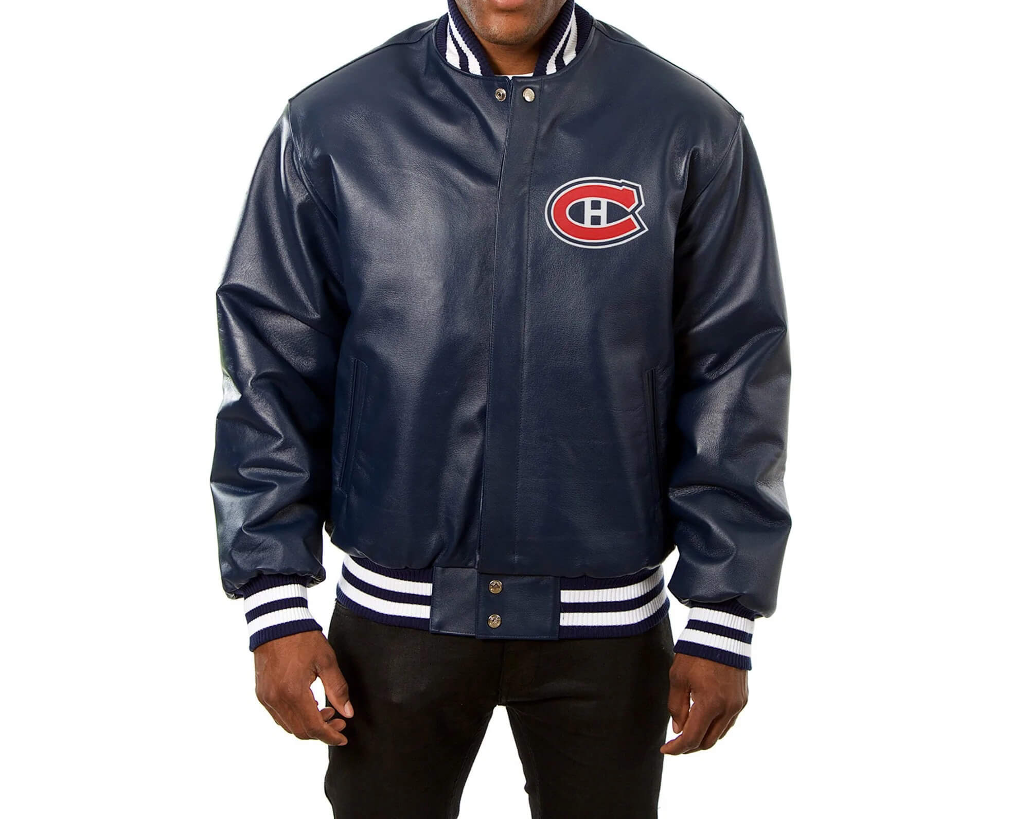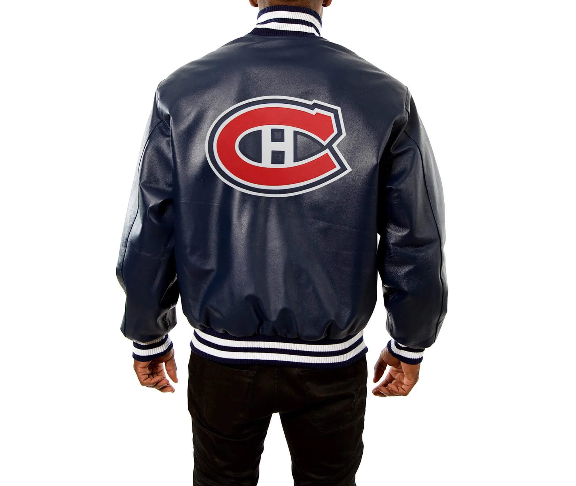 This Montreal Canadiens Navy NHL Leather Jacket is made from high-quality leather material. The jacket is available in glorious navy color which gives it an innovative and enchanted look. The collar of the jacket is a rib knit. It has a snap button front closure. The soft viscose inner lining of the jacket keeps you warm and relaxed. This Montreal Canadiens Navy NHL Leather Jacket has full-length sleeves that end with rib knit cuffs. The jacket has two front pockets for keeping stuff. The top-quality stitching of the Montreal Canadiens Leather Jacket makes it durable and desirable to wear.