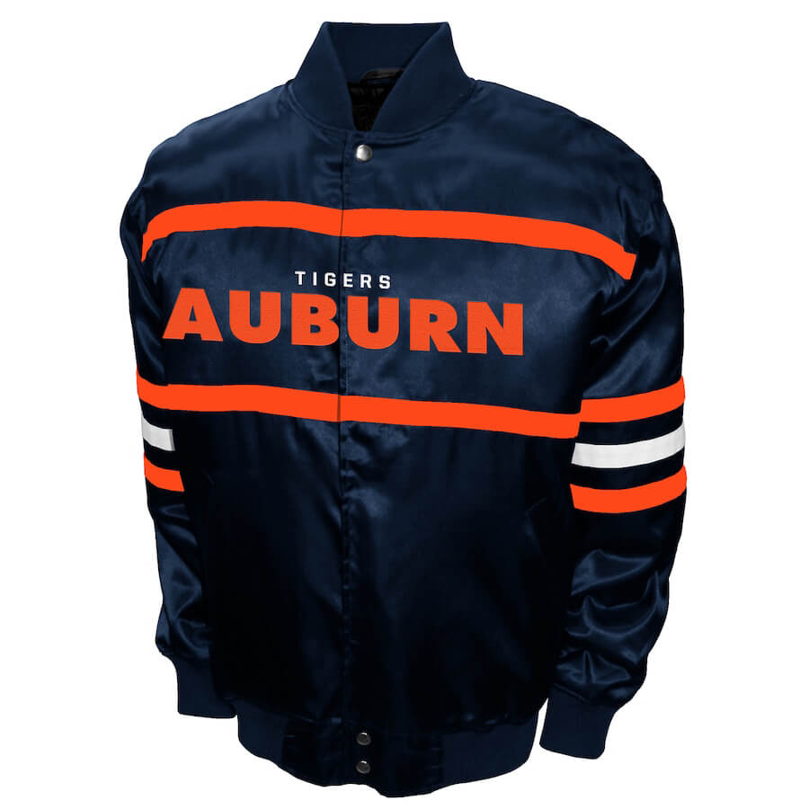 The NCAA Navy Auburn Tigers Full-Snap Satin Jacket. Made from high-quality satin exterior and soft viscose lining, it blends comfort and bold team spirit.
