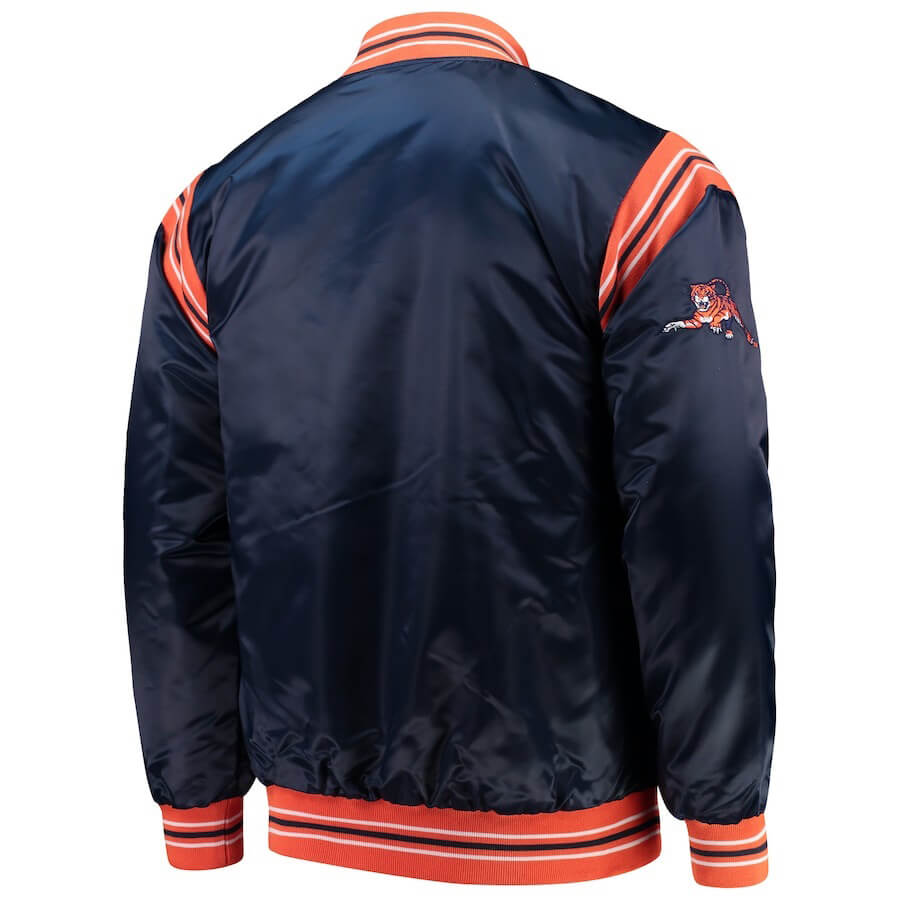 The NCAA Team Auburn Tigers Full-Snap Navy Satin Jacket. Made with a sleek satin outer and soft viscose lining, it delivers comfort and standout game-day flair. The navy blue finish is accented by rib-knitted collar, cuffs, and waistband for a classic varsity fit.