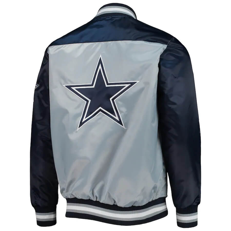This “ Dallas Cowboys Gray And Navy Satin Jacket” is made from high-quality satin material. It has an inner lined soft and comfortable Viscose stitched that keeps you warm in the cold and chilly weather. It has a front Button Style for its closure with a Rib knitted collar that makes it a retro classic. The Jacket has a Gray and Navy color that makes it stand out. The Rib knitted cuffs and Rib knitted hemline also look attractive. The Jacket has Two Side Handwarmer pockets. Dallas Cowboys Logo on the left sleeve and on the back looks very beautiful. The jacket is durable to wear due to its fine quality stitching.