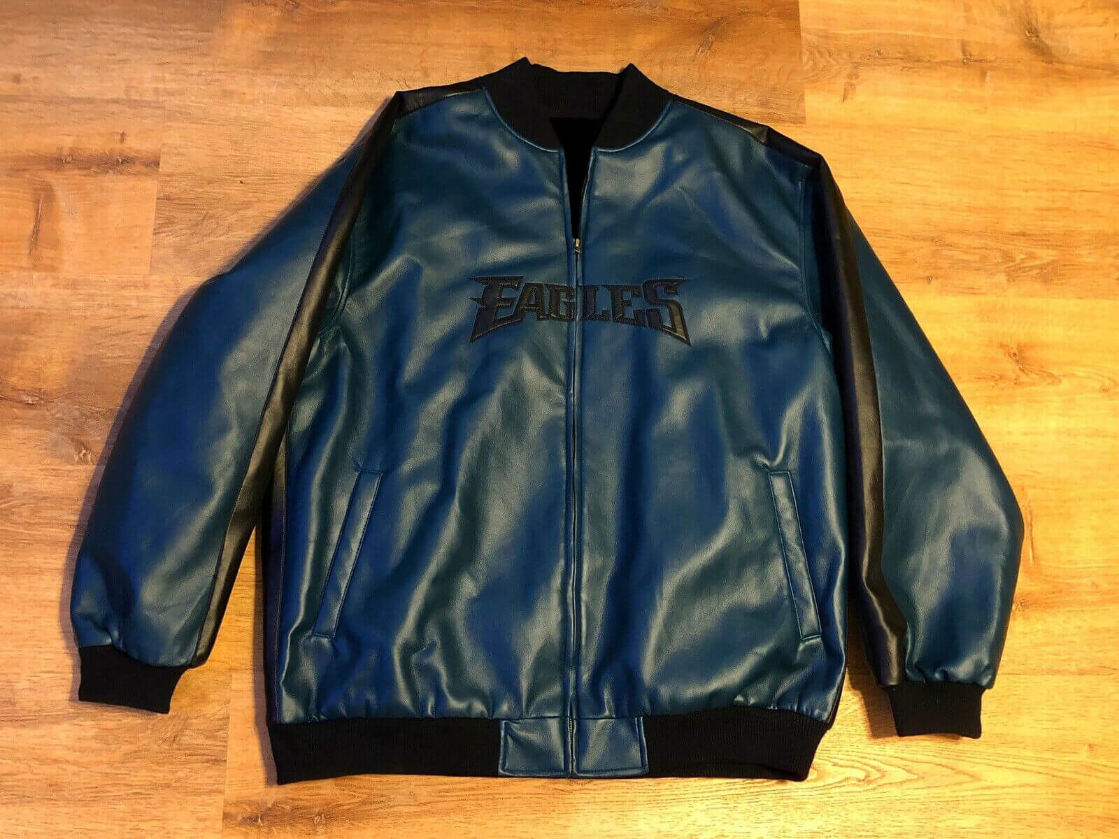 This “ Philadelphia Eagles Blue And Black Leather Jacket” is made from high-quality leather material. It has an inner lined soft and comfortable Viscose stitched that keeps you warm in the cold and chilly weather. It has a front YKK Branded Zipper Style for its closure with a Rib knitted collar that makes it a retro classic. The Jacket has a Blue and Black color that makes it stand out. The Rib knitted cuffs and Rib knitted hemline also look attractive. The Jacket has Two Side Handwarmer pockets. Philadelphia Eagles Logo on the back looks very beautiful. The jacket is durable to wear due to its fine quality stitching.