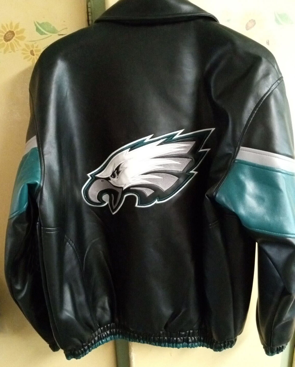 This “ Team Philadelphia Eagles Football Leather Jacket” is made from high-quality leather material. It has an inner lined soft and comfortable Viscose stitched that keeps you warm in the cold and chilly weather. It has a YKK Branded Zipper Style for its closure with a Shirt Style collar that makes it a retro classic. The Jacket has a Black, Green, and Gray color that makes it stand out. The Elastic cuffs and Elastic hemline also look attractive. The Jacket has Two Side Handwarmer pockets. The Philadelphia Eagles Logo on the back looks very beautiful. The jacket is durable to wear due to its fine-quality stitching.