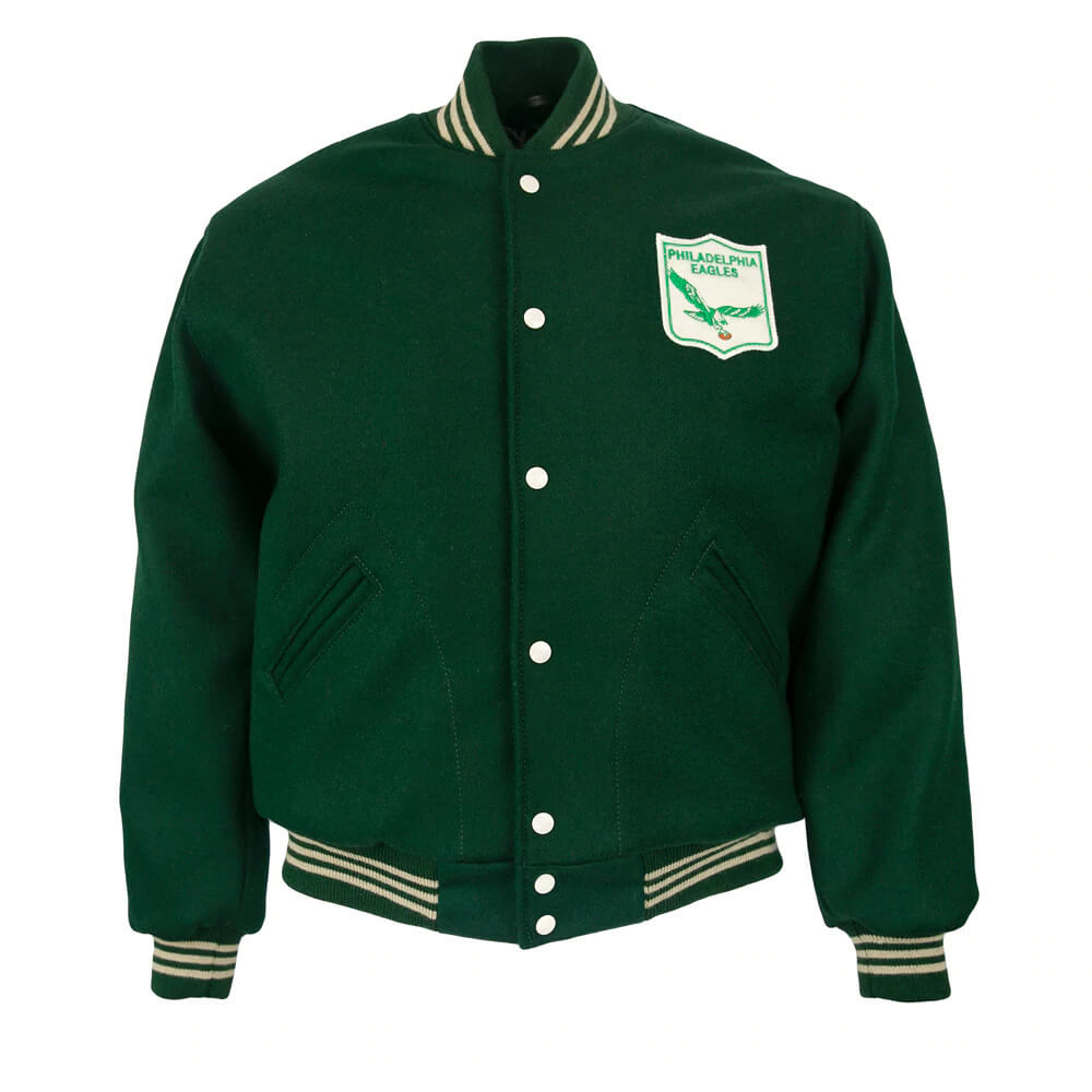 This “Philadelphia Eagles 1960 Varsity Jacket” is made from high-quality wool material. It has an inner lined soft and comfortable Viscose stitched that keeps you warm in the cold and chilly weather. It has a front Button Style for its closure with a Rib knitted collar that makes it a retro classic. The Jacket has a Green color that makes it stand out. The Rib knitted cuffs and Rib knitted hemline also look attractive. The Jacket has Two Side Handwarmer pockets and looks very beautiful. The jacket is durable to wear due to its fine quality stitching.