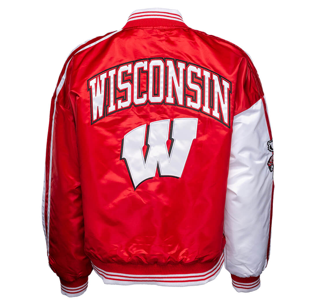 The Red White NCAA Wisconsin Badgers Team Satin Jacket. Made from high-quality satin with a soft viscose lining, this jacket offers comfort, shine, and school spirit all in one. The red and white color combo stands out, while rib-knitted collar, cuffs, and waistband provide a snug, sporty fit.
