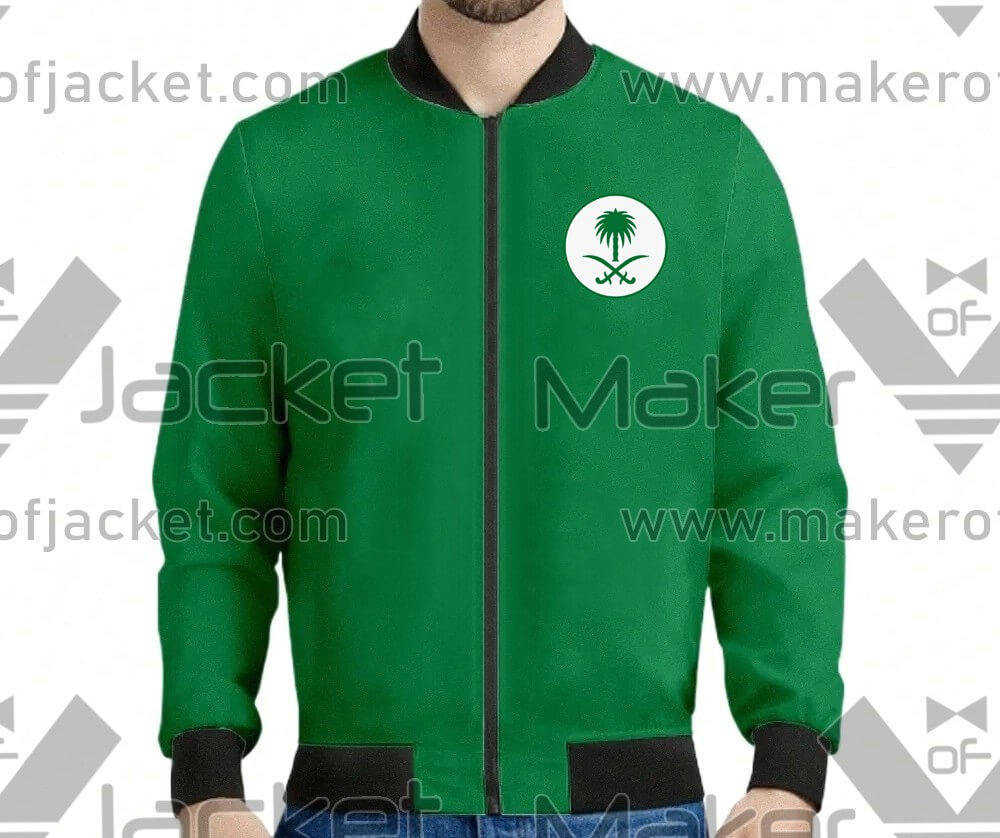 The Saudi Arabian Flag Print Green Bomber Jacket blends heritage with modern style. Featuring a polyester outer, viscose lining, and a bold green finish, it’s designed for comfort and durability. The palm logo on the chest and back highlights national pride, while the rib-knitted collar, cuffs, and waistband ensure a perfect fit. Finished with a reliable YKK zipper and two side pockets, this jacket delivers both function and flair. A versatile piece that celebrates culture while elevating everyday fashion.