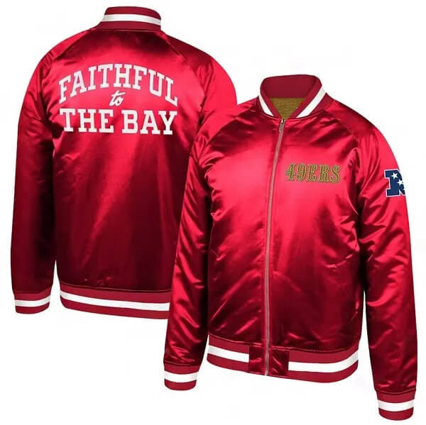 Scarlet San Francisco 49ers Faithful To The Bay Satin Jacket. Crafted for true fans, this jacket embodies the spirit of the Bay Area with its bold design and premium quality.