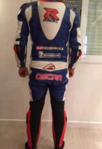 This “Suzuki Yoshimura Motorcycle Racing Leather Suit” is made from high-quality leather material. It has an inner lined soft and comfortable polyester mesh stitched that keeps you warm in the cold and chilly weather. It has a front YKK Branded Zipper style for its closure with a Round Neck collar that makes it a retro classic. The Jacket has a Blue, White, Red, and Black color that makes it stand out. The Zipper cuffs also look attractive. Suzuki Motorcycle Logo on the front and on the sleeves. The suit is durable to wear due to its fine quality stitching.
