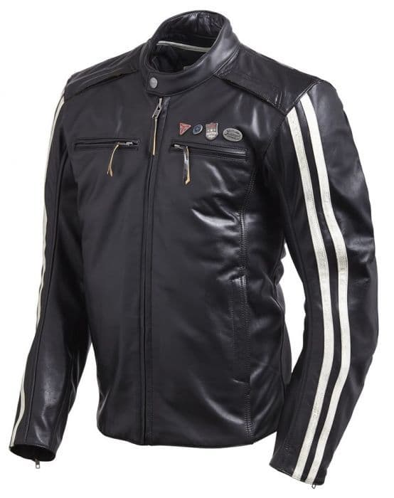 This Triumph Motorcycle Racing Black Leather Jacket is made from high-quality leather material. It has an inner lined soft and comfortable viscose stitched that keeps you warm in the cold and chilly weather. The Jacket has a front YKK branded zipper for its closure with a Snap collar that makes it a retro classic. The jacket has a black and white color that makes it stand out. The Zipper cuffs also look attractive. The Triumph logo at back looks beautiful. The jacket is durable to wear due to its fine quality stitching.