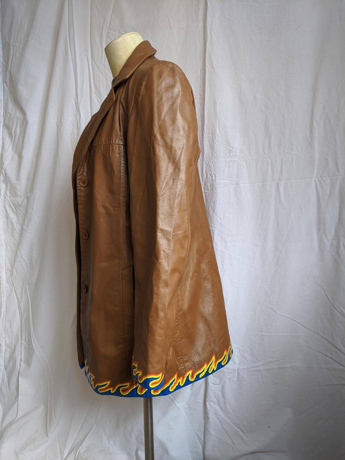 The production for Vintage Brown Flame Hand Painted Leather Jacket has been crafted from leather and internal appeal as viscose lining that will keep you comfortable and ease throughout the day. The frontage of the Vintage Brown Flame Hand Painted Leather Jacket is a smoothly Button closure while comprised of two waist pockets that will not only help you to keep your personal belonging, but it will also keep your hands warm in the winter season. This outwear has brown in color. The apparel looks best with the decoration of Hand painted blue flames at the sleeve and bottom rim and Notch lapel collar which makes it look retro-classic. What are you waiting for? Grab this appealing piece and step towards the world of fashion.