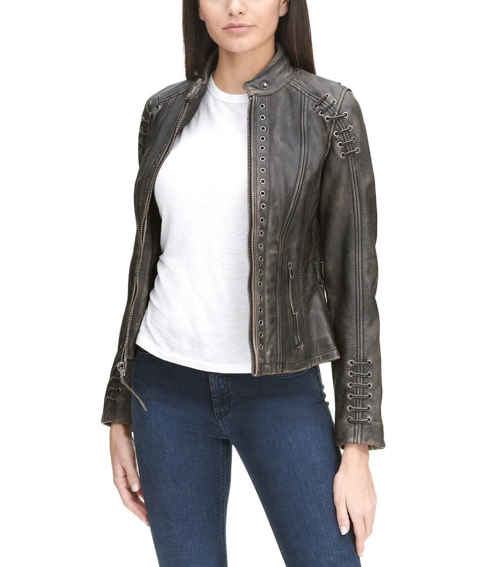 - Full-zip placket accented with grommets; tab collar with snap closure