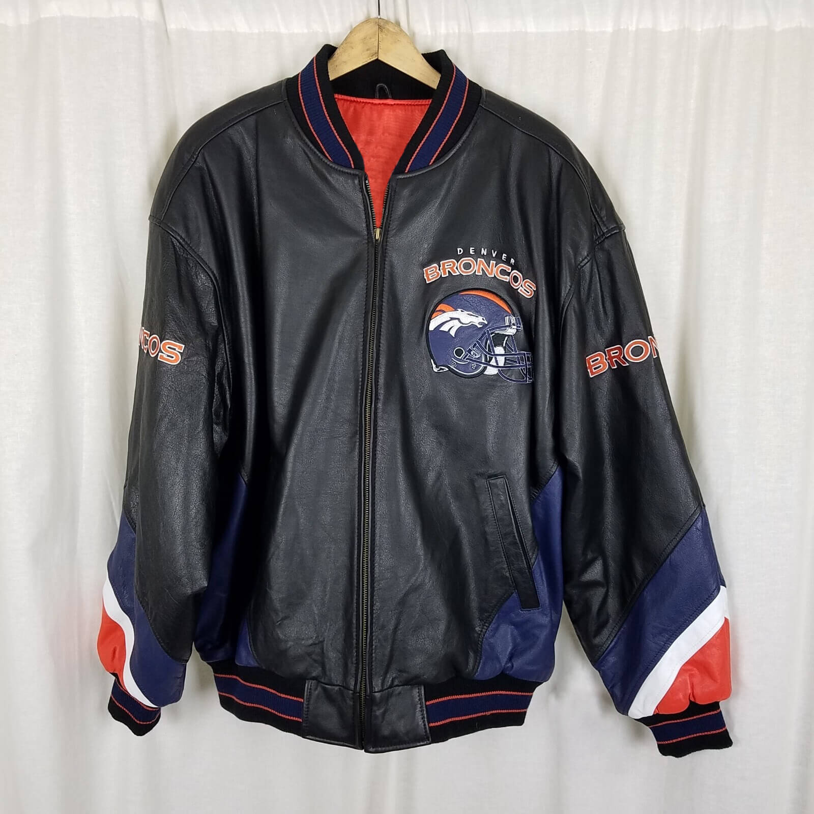 Vintage Denver Broncos Leather Bomber Jacket. Crafted from high-quality leather with a soft viscose lining, it features a bold black, blue, white, and orange design.
