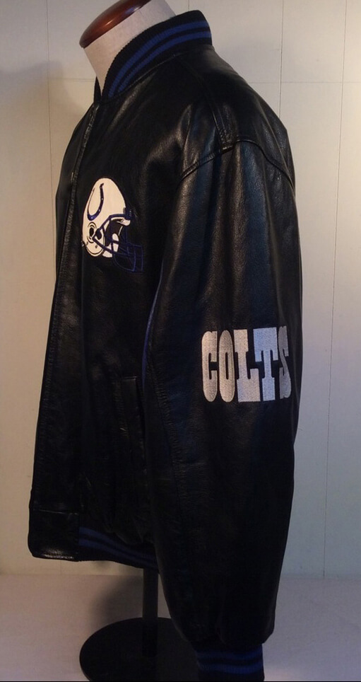 This “Vintage G-III Carl Banks Indianapolis Colts Leather Jacket” is made from high-quality leather material. It has an inner lined soft and comfortable viscose stitched that keeps you warm in the cold and chilly weather. It has a front YKK Branded Zipper style for its closure with a Rib knitted collar that makes it a retro classic. The Jacket has a Black and Blue color that makes it stand out. The Rib knitted cuffs and Rib knitted Hemline also looks attractive. The Jacket has Two Side Handwarmer pockets. The Indianapolis Colts Logo on the back looks very beautiful. The jacket is durable to wear due to its fine-quality stitching.
