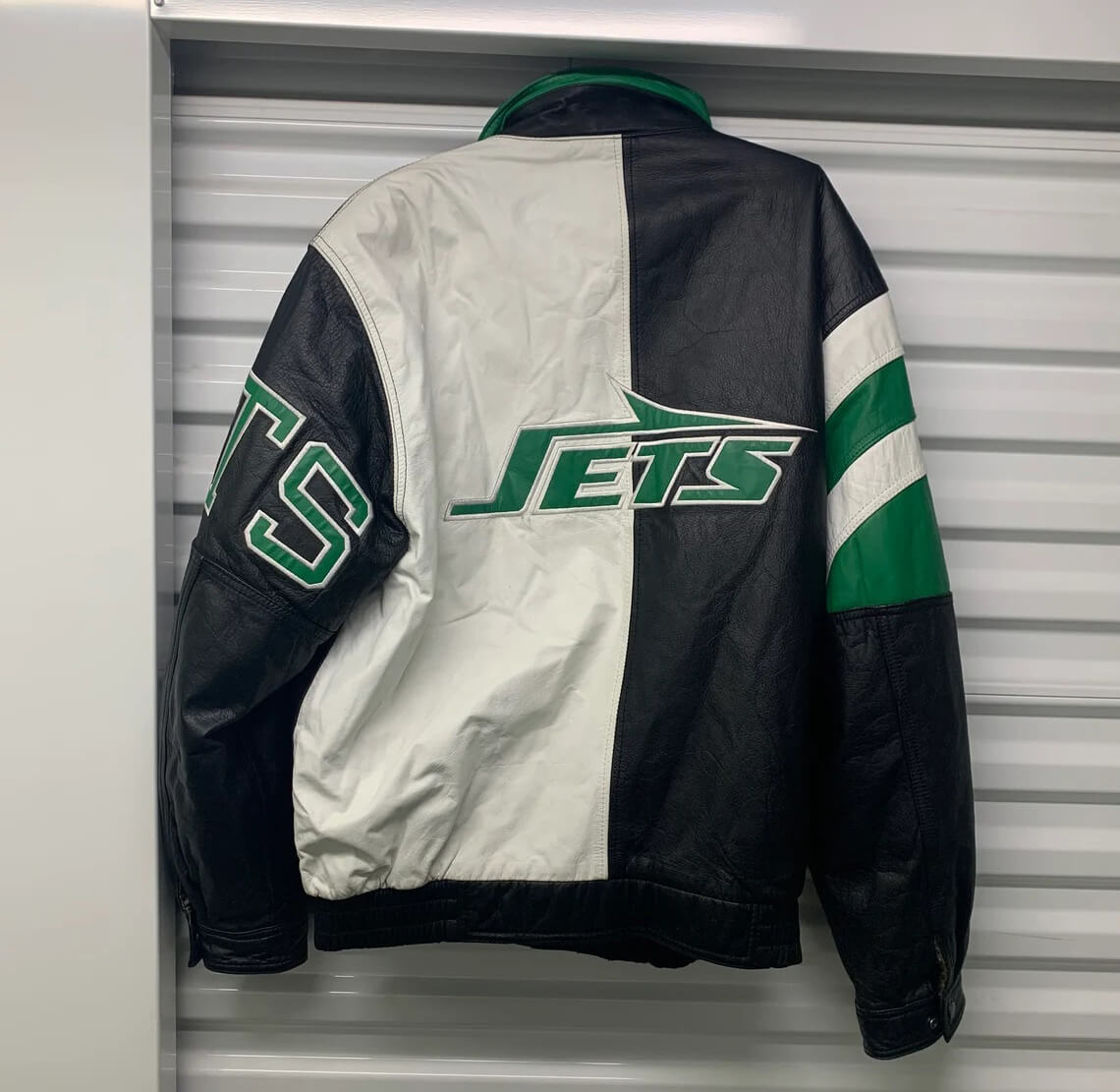 This “Vintage New York Jets Team Leather Jacket” is made from high-quality leather material. It has an inner lined soft and comfortable Viscose stitched that keeps you warm in the cold and chilly weather. It has a YKK Branded Zipper Style for its closure with a High Neck collar that makes it a retro classic. The Jacket has a Black, White, and Green color that makes it stand out. The Snap cuffs and Elastic hemline also look attractive. The Jacket has Two side Handwarmer pockets and looks very beautiful. The jacket is durable to wear due to its fine-quality stitching.