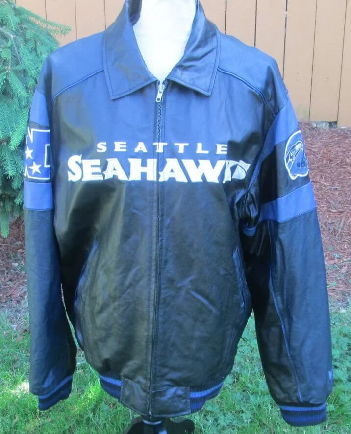 This “Vintage Seattle Seahawks Team Leather Jacket” is made from high-quality leather material. It has an inner lined soft and comfortable Viscose stitched that keeps you warm in the cold and chilly weather. It has a YKK Branded Zipper Style for its closure with a Shirt Style collar that makes it a retro classic. The Jacket has a Black and Navy color that makes it stand out. The Rib knitted cuffs and Rib knitted hemline also look attractive. The Jacket has Two side Handwarmer pockets. The Seattle Seahawks Logo on the left chest looks very beautiful. The jacket is durable to wear due to its fine quality stitching.