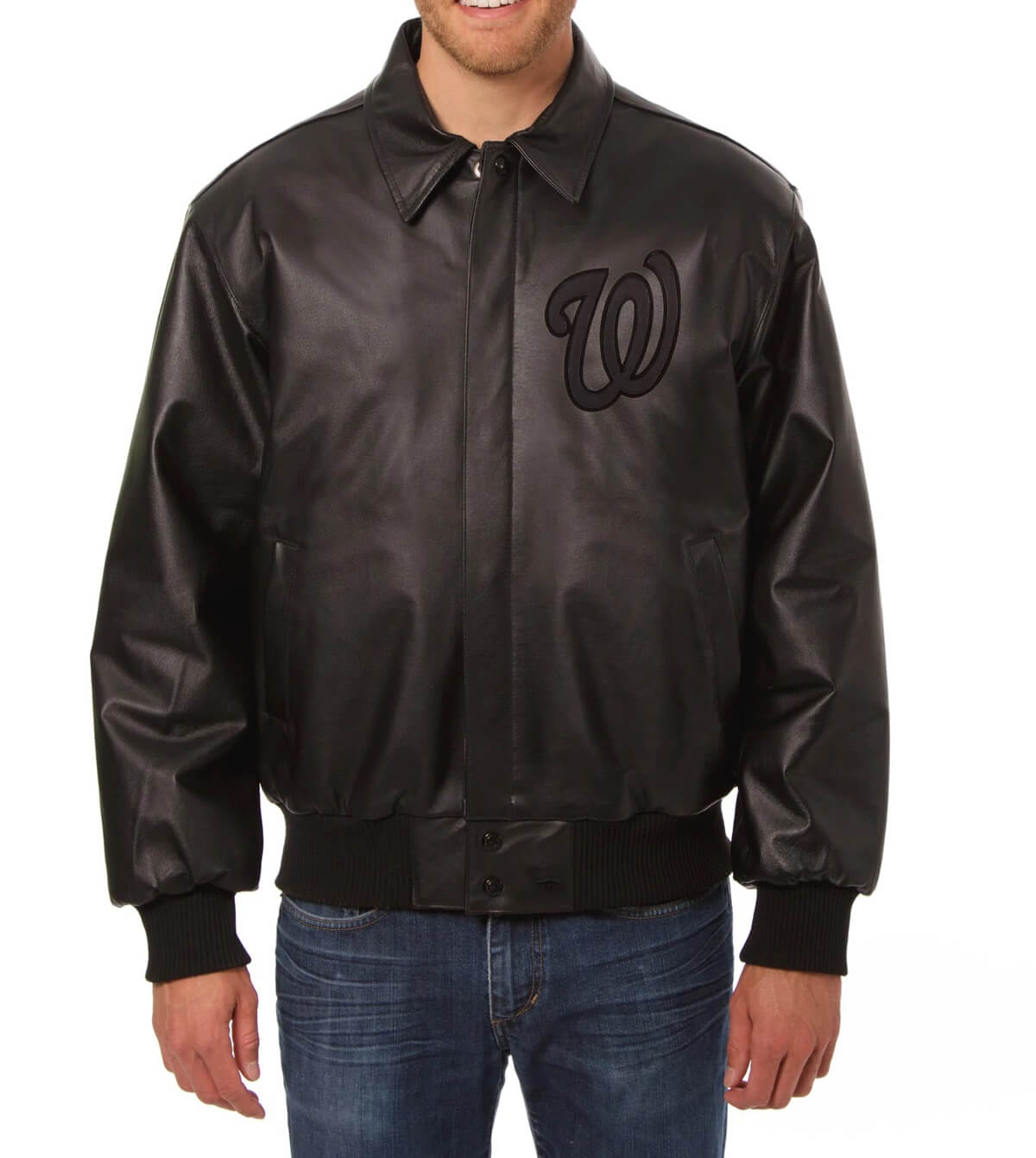 This Washington Nationals Black Leather MLB Jacket is made from high-quality leather material. The jacket is available in a glorious black color which gives it an innovative and enchanted look. The collar of the jacket is a shirt style. It has a button front closure. A soft viscose inner lining of the jacket keeps you warm and relaxed. This Washington Nationals Black Leather Jacket has full-length sleeves that end with rib knit cuffs. The jacket has two side waist pockets for keeping stuff. The top-quality stitching of the Washington Nationals Leather Jacket makes it durable and desirable to wear.