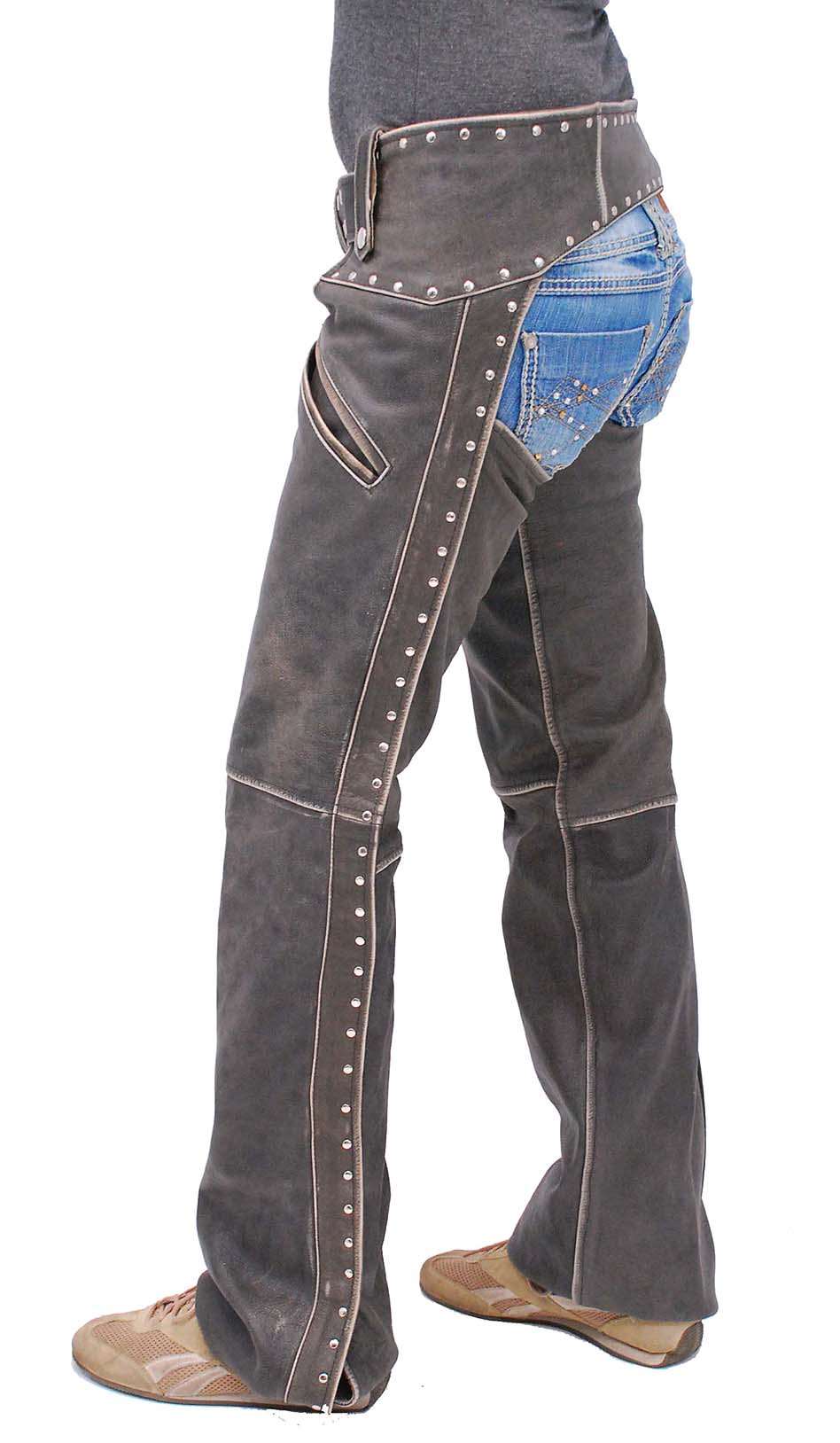 Low rise vintage brown leather chaps w/rivet stud trim & pants pockets for women. This attractive brown pocket chaps come with a zipper cover wind flap trimmed with rivets, hidden snaps on each leg cuff, premium buffalo leather and heavy duty YKK zippers.